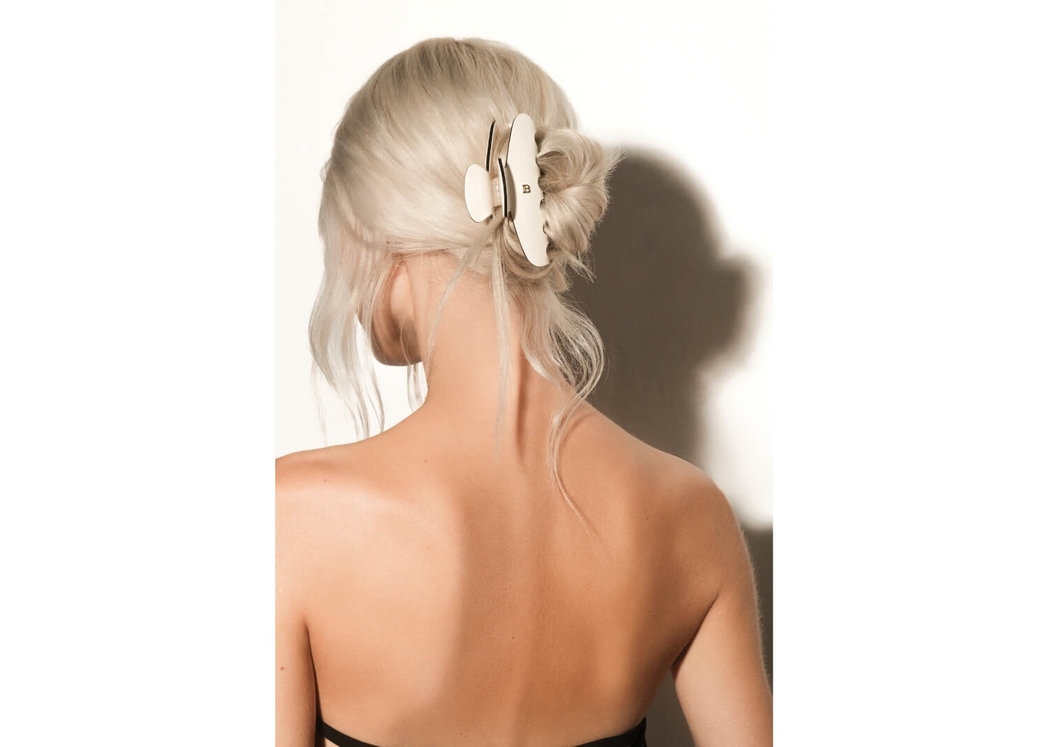 El yapımı olarak dayanıklı selüloz asetattan üretilen bu beyaz-siyah büyük boy claw klips, Balmain’in ikonik 18K altın kaplama “B” logosuyla tasarlanmıştır. Beyaz gövde ve siyah kenarların yarattığı kontrast, her saç stiline zarafet ve sofistike bir dokunuş katar. Güçlü ama esnek yapısı kalın ve uzun saçlarda güvenli tutuş sağlar. Hipoalerjenik yapısı sayesinde saç ve saç derisine nazik davranır. Modern şıklıkla işlevselliği birleştiren bu tasarım, günlük veya özel kullanımlar için idealdir.