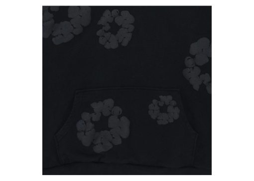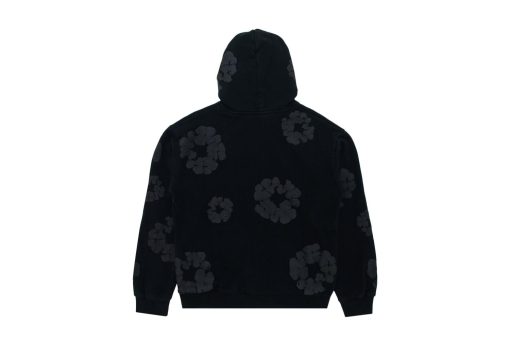 Denim Tears Cotton Wreath Hoodie Black Monochrome, kanguru ön cebe sahip, %100 pamuklu, siyah kapüşonlu bir sweatshirttür. Sweatshirt kumaşında, sweatshirt'ün tüm gövdesinde görünen siyah puf mürekkepli serigrafi baskı ile işlenmiş çiçekli çelenk baskısı bulunur. Denim Tears markası yakanın içindeki dokuma etikette yer alır.