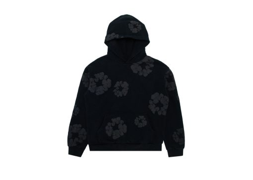 Denim Tears Cotton Wreath Hoodie Black Monochrome, kanguru ön cebe sahip, %100 pamuklu, siyah kapüşonlu bir sweatshirttür. Sweatshirt kumaşında, sweatshirt'ün tüm gövdesinde görünen siyah puf mürekkepli serigrafi baskı ile işlenmiş çiçekli çelenk baskısı bulunur. Denim Tears markası yakanın içindeki dokuma etikette yer alır.